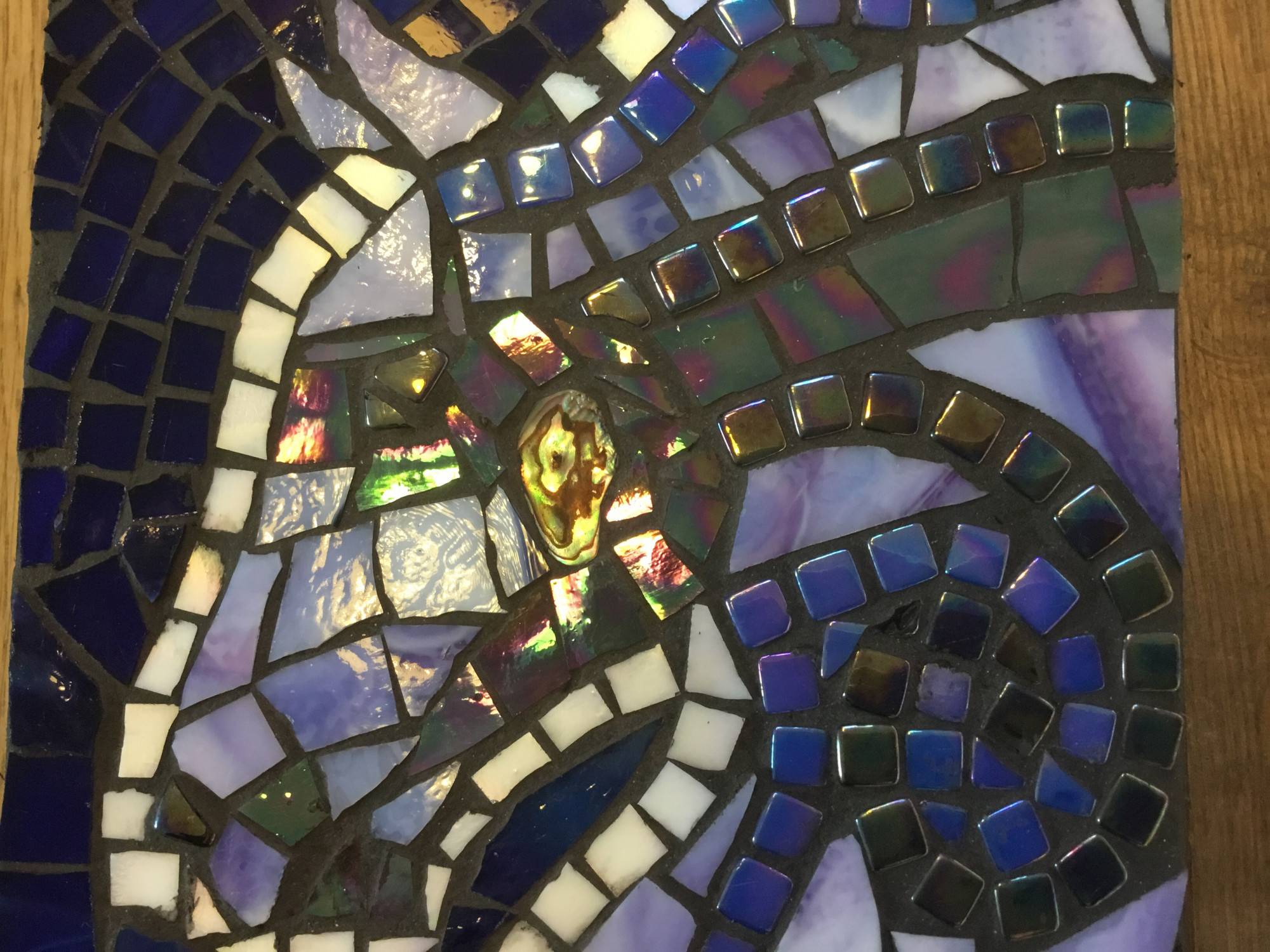 Mother of pearl textured mosaic. Horse was painted first then textured mother of pearl and oil placed on background. Reminiscent of the crazy horse memorial in South Dakota.
